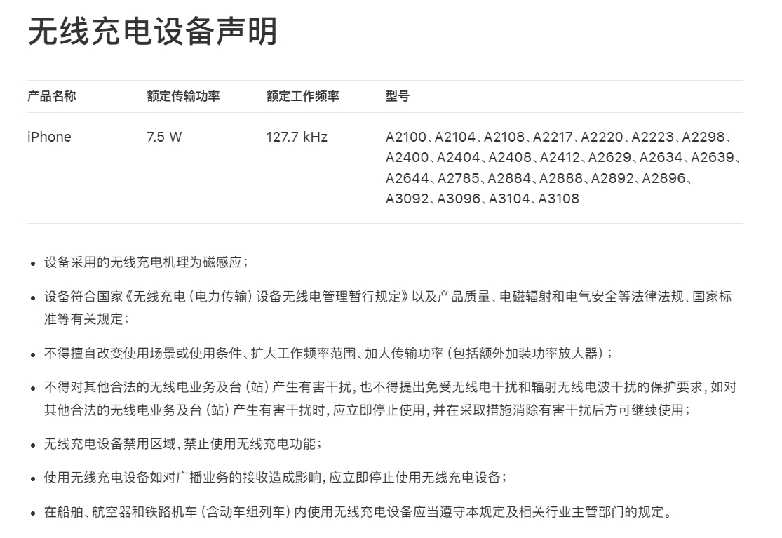 小雷注意到,目前苹果中国官网的无线充电设备声明界面关于iPhone的无线充电额定传输功率已更改为7.5W、工作频率127.7kHz,且强调设备符合新规。